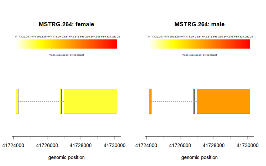 In the figure above for geneID, MSTRG.264, we see that the mean expression is higher in male samples. We can verify this is the fc column of the results_transcripts. The value of fc should be greater than 1.