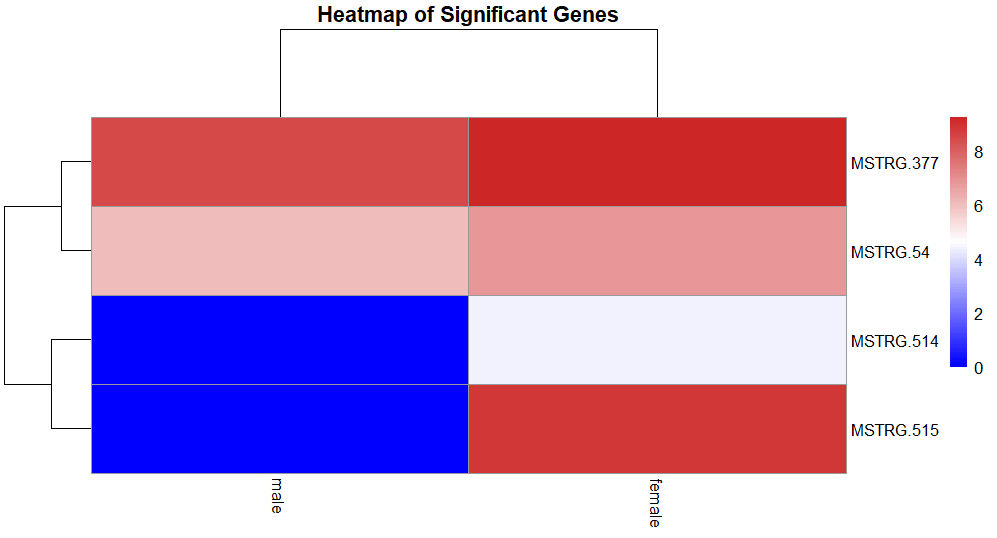 dim(sig_genes)[1] 4 5So, out of 848 genes only 4 genes have expression that is significantly different between males and females. Note that we have assembled genes present on only X-chromosome so there are only 848 genes our data.