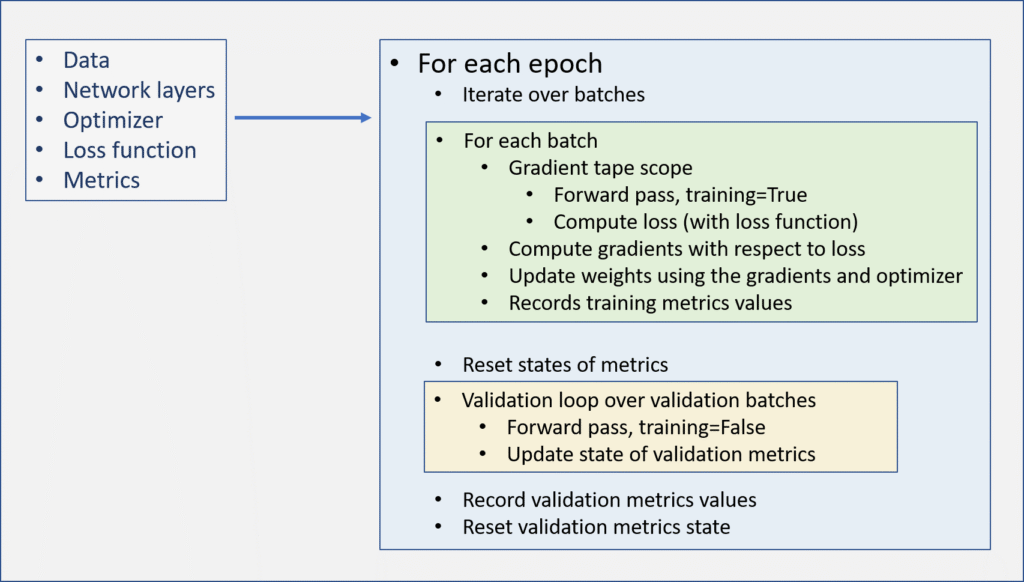 If we want to control exactly how the training occurs, we need to do the training using custom loop for each epoch and batch of the training data, implementing the above steps.